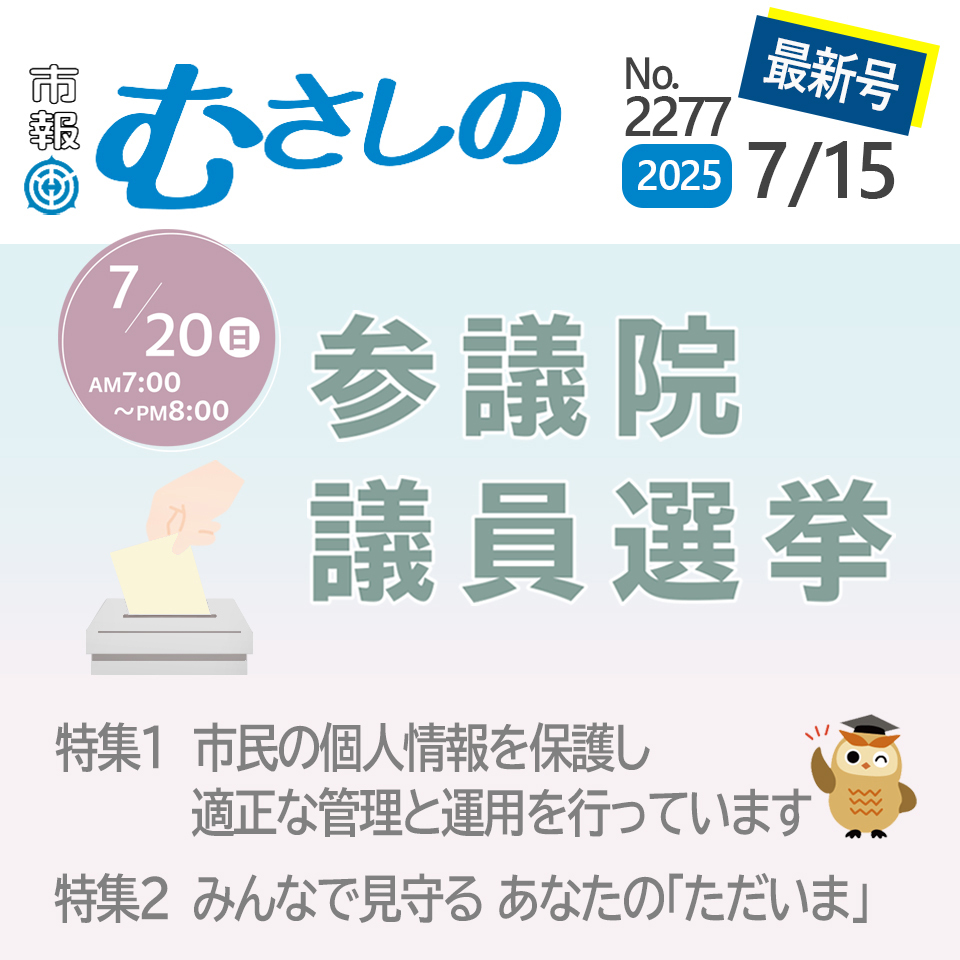 【「市報むさしの」7月15日号No.2277を発行しました】今号の特集は「7月20日(日)参議院議員選挙」「市民の個人情報を保護し適正な管理と運用を行っています」「みんなで見守るあなたの『ただいま』」..