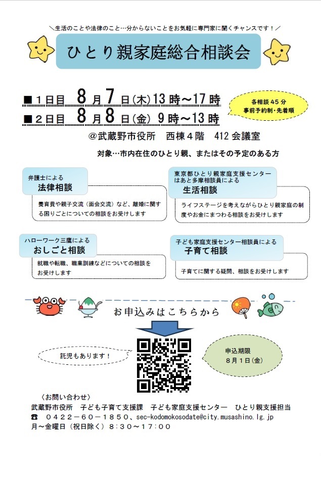 【ひとり親家庭総合相談会を開催します】専門家に疑問やお悩みを相談しませんか。日程:8月7日(木)・8日(金)場所:市役所西棟412会議室対象:市内在住のひとり親、またはその予定のある方申込:申込フォー..