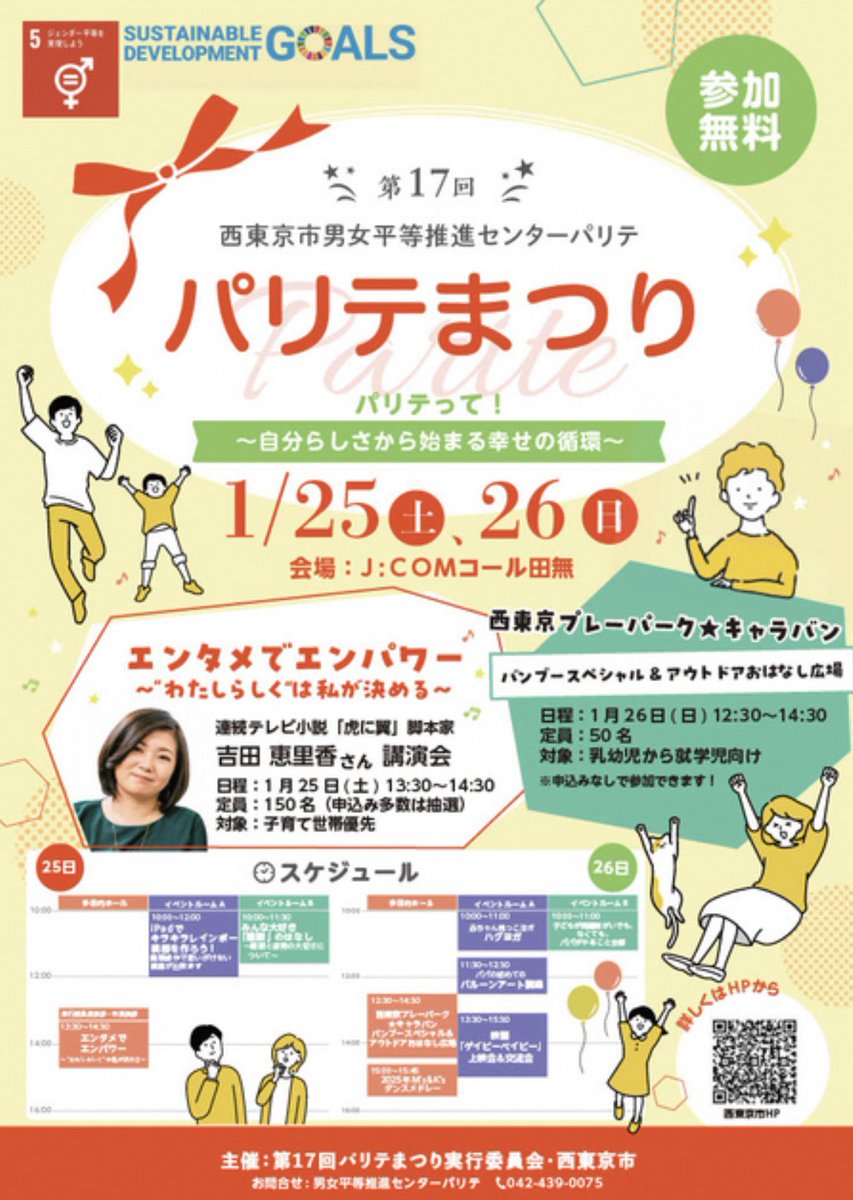 〈パリテまつり〉2025年1月25日(土)26日(日)J:COMコール田無にて開催話題になった朝ドラ「虎に翼」の脚本家吉田恵理子さんの講演会もあります!詳しくは12月15日号の市報やホームページをご確..