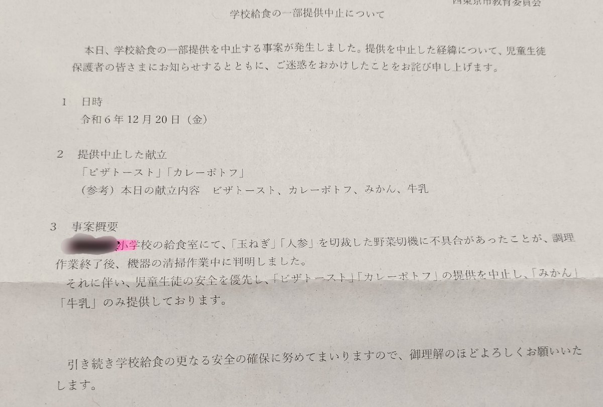 またもや給食での報告です。今日は12月20日に市内小学校の調理室(親子給食なので中学校にも提供される)で野菜切り機の刃が折れ、給食のピザトーストとカレーポトフが提供できなかった件での説明会に行ってきま..