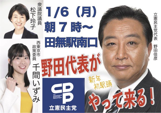 明日から仕事始めの方も多いですね明日、朝7:00〜田無駅南口野田代表、松下玲子総支部長と朝活を行います!1/26〜の市議補選に向け活動中の「千間いずみ」さん(いずみん先生)も参加せわしない朝ですが、通..