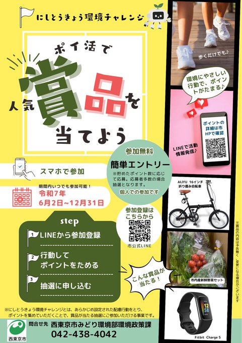 \にしとうきょう#環境チャレンジ/#環境に配慮した行動でゲットしたポイントに応じ、賞品が当たる抽選に応募可能毎月配信のクイズに挑戦で20P獲得できます!9月は22日(月)配信予定!※クイズの挑戦には配..