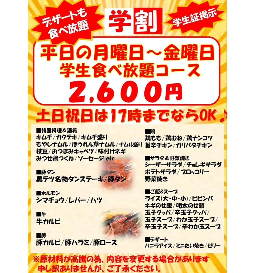 こんにちは、黒テツ立川店です!黒テツは学生様大歓迎です♪学生コースご用意してるので、是非是非ご来店ください♪100分食べ放題コース●黒テツ逸品コース3200円●牛タン付満腹コース3700円●希少部位付..