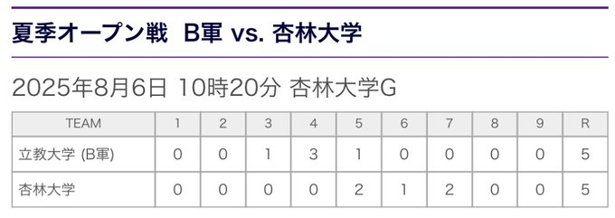 【オープン戦結果速報】《B軍戦》対杏林大学(杏林大学G)R001310000=5K000021200=5※詳細は後ほどオフィシャルサイトに掲載いたします。#tokyobig6#rikkiobaseba..