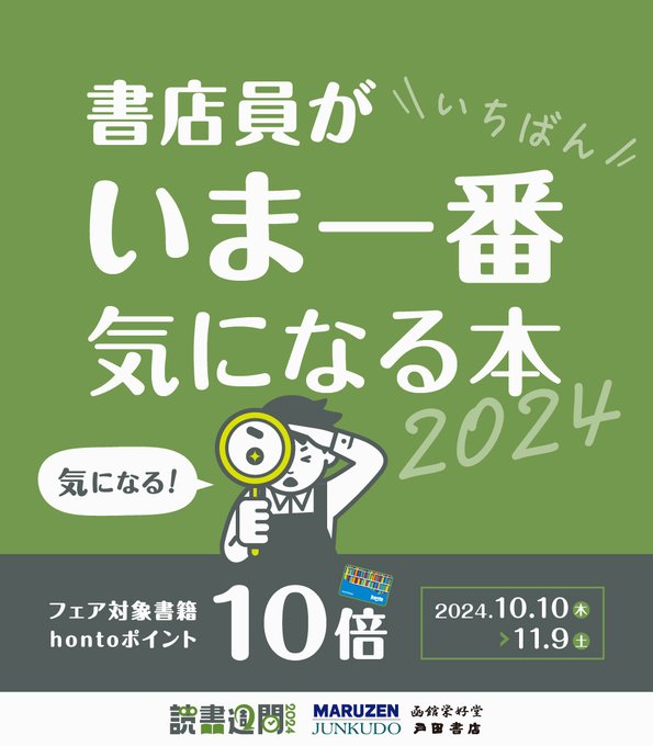 【書店員がいま一番気になる本】10/10~11/9の期間、丸善ジュンク堂書店の店員が「いま一番気になる本」43冊をあつめたフェアを開催しています対象商品のhontoポイントが10倍になるキャンペーンも..