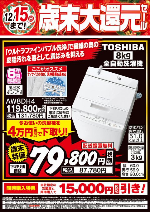 【~12/15(日)まで3F】東芝の8Kg#全自動洗濯機AW-8DH4下取後価格税込87,800円!!ナノサイズの泡を含んだウルトラファインバブル水で繊維の隙間の奥の汚れまでしっかり洗浄低振動・低騒音..