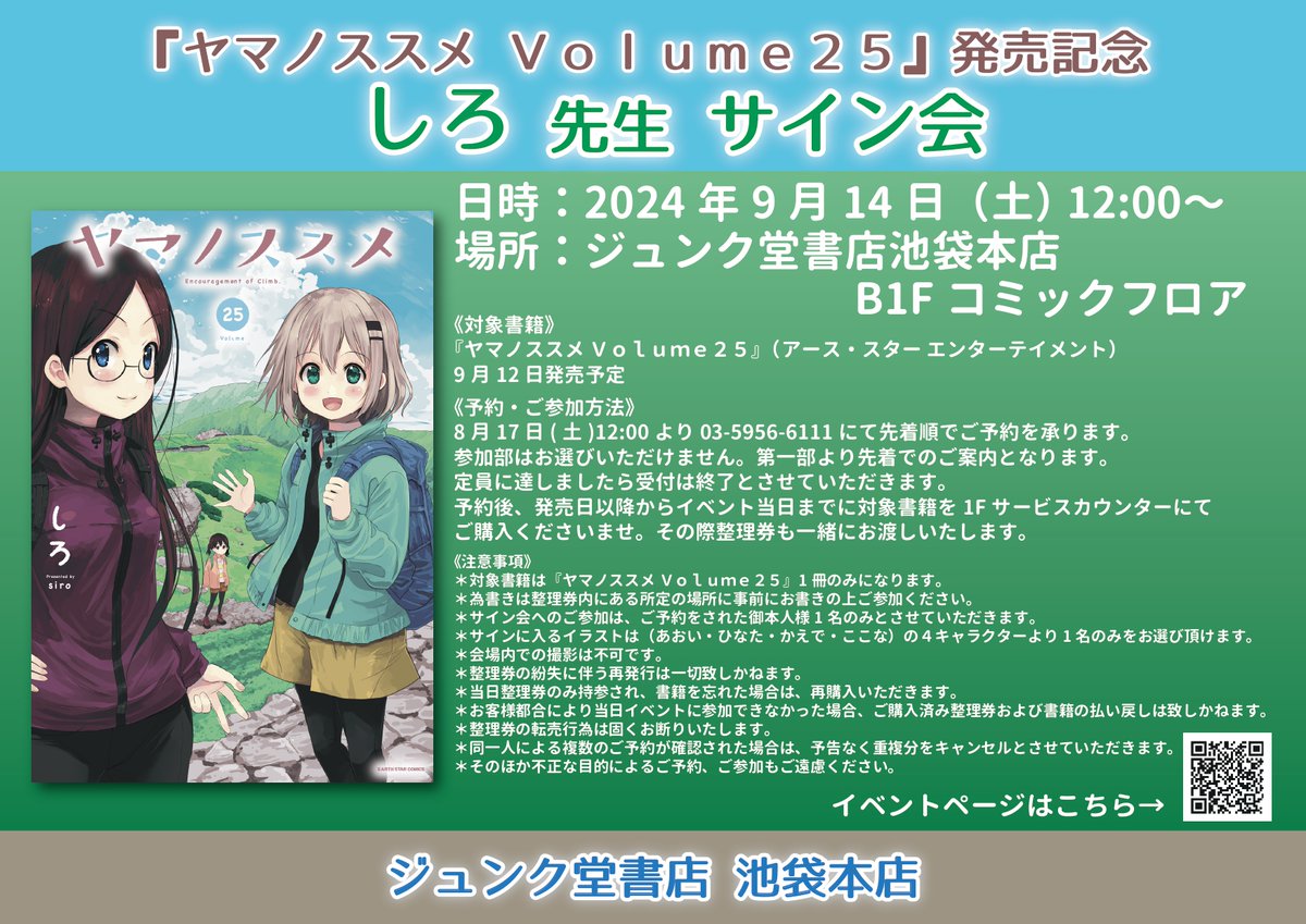 【サイン会告知】「ヤマノススメVolume25」発売を記念して、しろ先生サイン会を開催致します予約受付開始:8/1712:00~開催日:9/1412:00~みなさまのご参加お待ちしております!⇓詳細は..