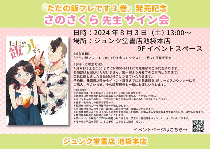 『ただの飯フレです3巻』(幻冬舎コミックス)刊行記念さのさくら先生サイン会、現在第4部15:20〜の回をご案内中です!ご予約はお電話または店頭で!(03-5956-6111)ご参加お待ちしております〜..