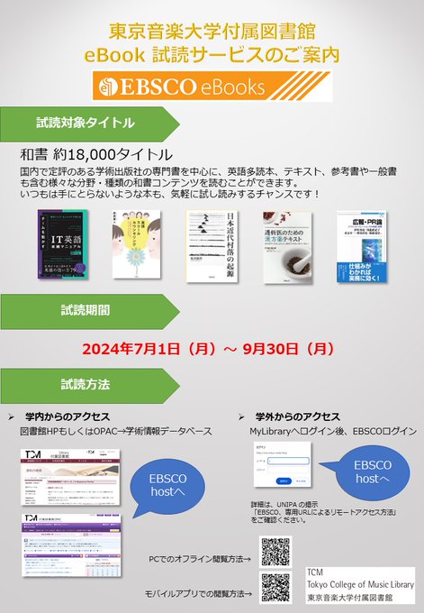 本日より、EBSCOeBooksの試読サービスが始まりました。和書18,000冊を読むことができます。この機会にぜひ、いつもは出会えない本を読んでみてください。9月末までの期間限定です!