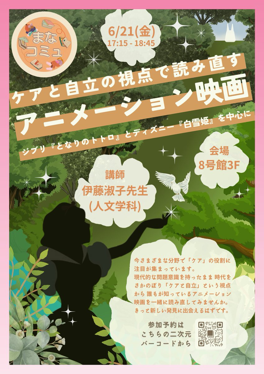 来週開催#まなコミュのご案内/𝟲/𝟮𝟭(金)ケアと自立の視点で読み直すアニメーション映画――ジブリ『となりのトトロ』とディズニー『白雪姫』を中心に\#ケアをテーマにおなじみのアニメ映画を読み解きます▼..