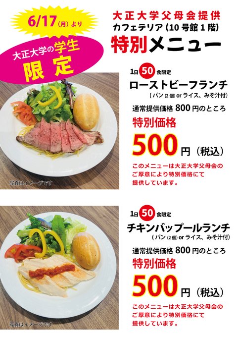 𝙉𝙀𝙒𝙎 #大正大学 の学生限定 父母会の提供で #カフェテリア(𝟭𝟬号館𝟭F)に 特別メニューが登場 来週 𝟲/𝟭𝟳(月)からの提供です ※特別メニューは予告なく終了する場合が ございます ▼詳細はこちらの画像をタップ
