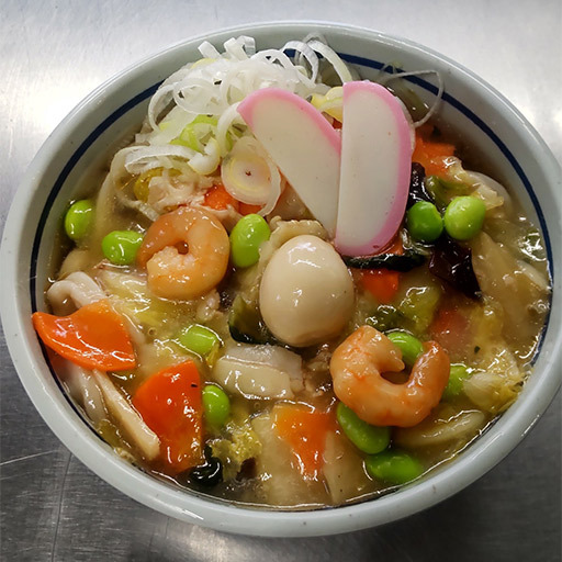 \フードカート「クリスマスメニュー」/ 9階屋上「かるかや」では『五目あんかけうどん(温)』(税込850円)が登場。エビや豚肉、白菜などの野菜を使用した具だくさんのオススメのあんかけうどんです! ■12/25(日)まで #食と緑の空中庭園