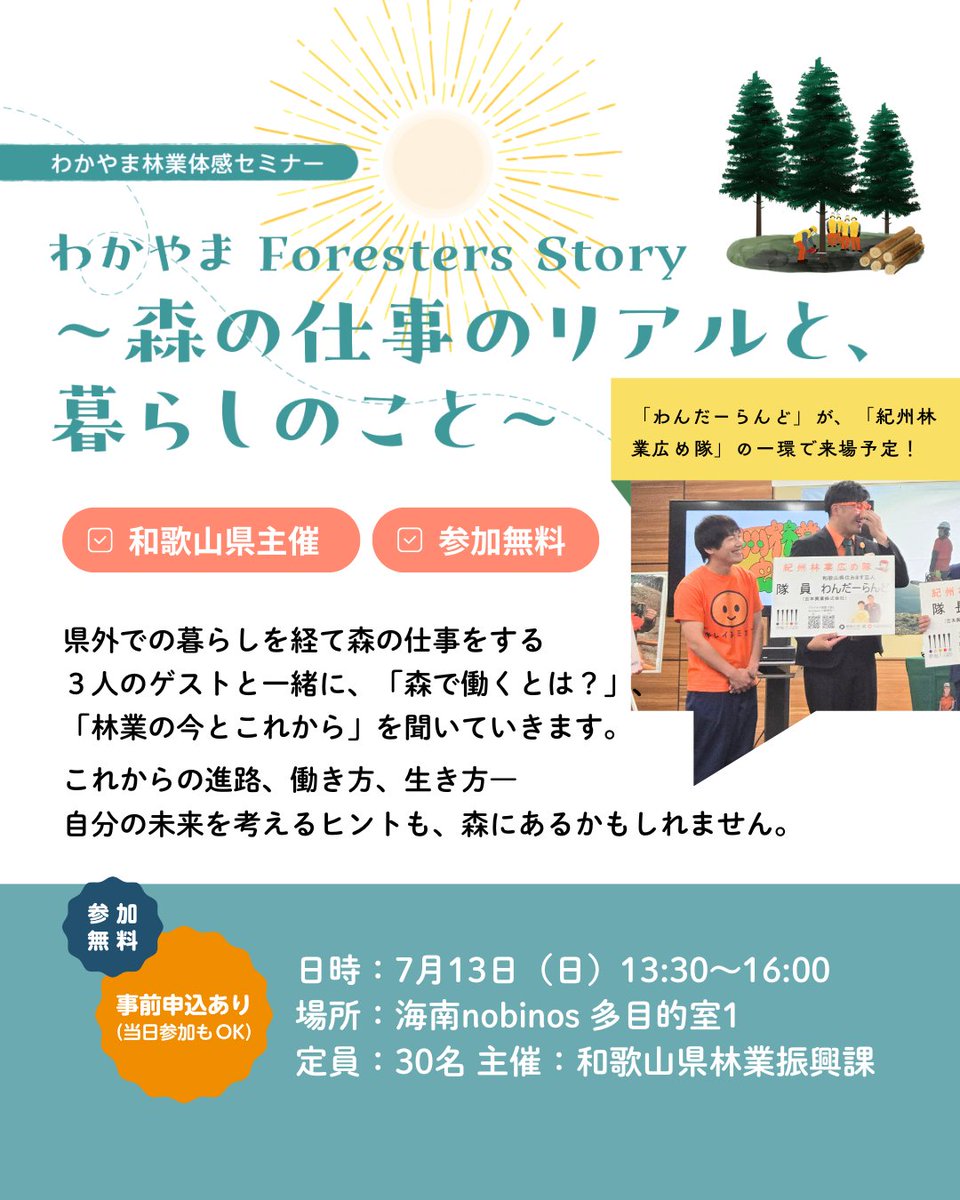 海南市で開催! 「わかやまForesters Story~森の仕事のリアルと暮らしのこと~ 」 本セミナーには、「わんだーらんど」のお二人が、 「紀州林業広め隊」活動の一環で来場される予定です。