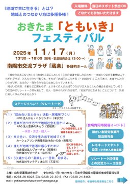 「地域で共に生きる」とは?「おきたま『ともいき』」フェスティバル」を11月17日(月)に南陽市交流プラザ「蔵楽」で開催します。誰もが役割と生きがいを持ち、助け合いながら暮らせる「地域共生社会」の実現に..