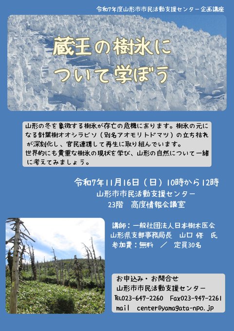 11月16日(日)10時から12時まで、「蔵王の樹氷について学ぼう」が開催されます。存亡の危機にあるアオモリトドマツ(オオシラビソ)の現状について考えてみませんか?詳細はこちらから↓https://y..