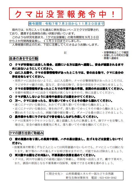 【ツキノワグマの出没に注意!】本日早朝、飯豊町椿の自宅敷地内で女性がツキノワグマに襲われケガをする事案が発生しました。県内では今年7件目の発生になります。柿や栗などの未収穫の果樹の実を目当てに、市街地..