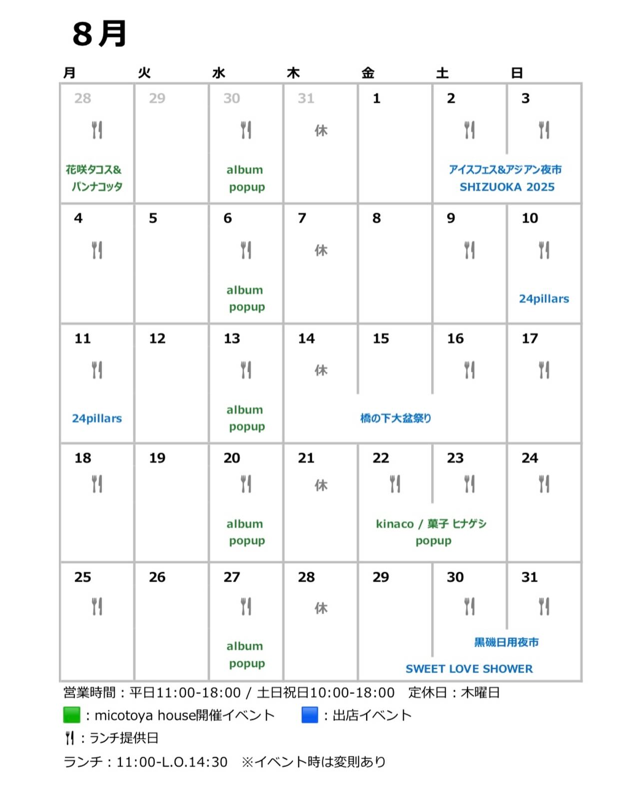 8月の営業予定です。8/1まで店舗は夏季休業中8月2日より通常営業となります。ご予約は7/30からInstagramDMまたはお電話で17時ごろまで受付可能です。(8/1はイベント出店のためDMのみの..