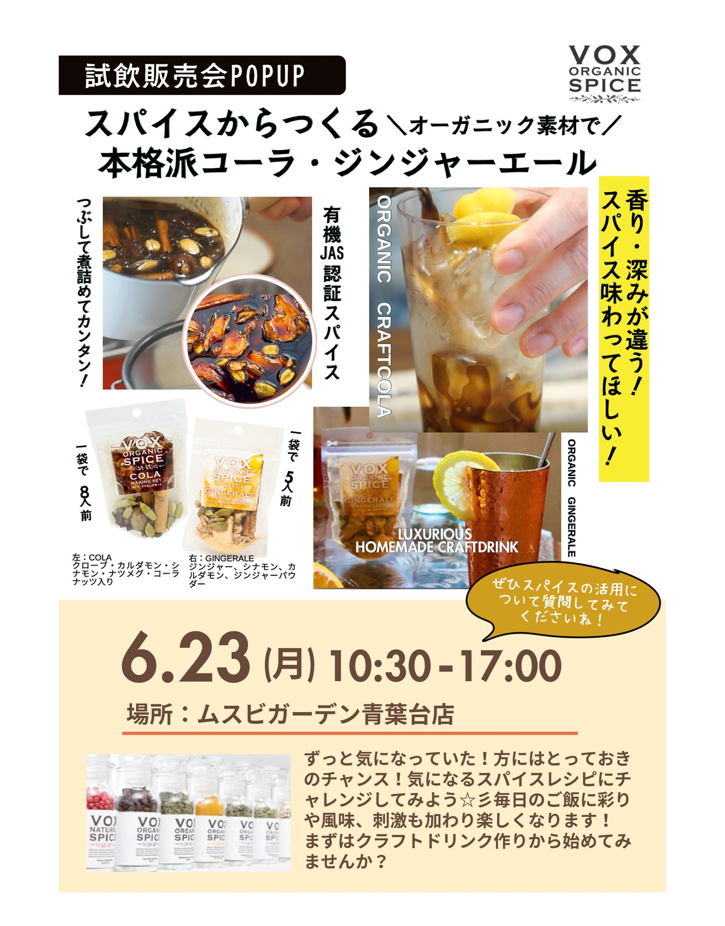.【6/23(月)POPUP開催!】\本格派クラフトコーラ&ジンジャーエールを堪能しよう/暑くて蒸し蒸し!🥵そんな毎日に、スパイスの力でグッと活力を!🫚🔥オーガニックの有機JAS認証スパイスでつくる、..