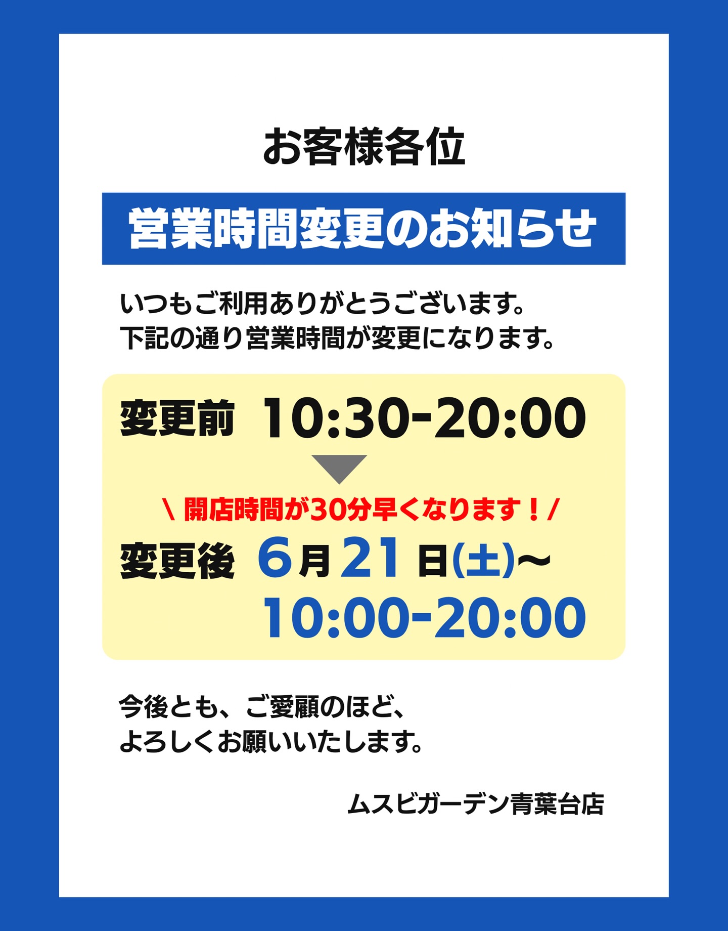 .📢営業時間変更のお知らせ日頃よりご利用いただき誠にありがとうございます。インスタ掲載が遅れてしまいましたが、このたび、開店時間を下記の通り変更させていただきました。⸻\Open時間が30分早くなりま..