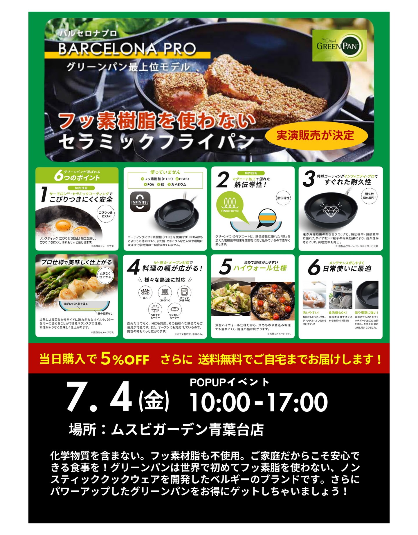 .【7月4日(金)限定!】🍳フッ素樹脂不使用!安心のセラミックフライパン「グリーンパン」実演販売🧑🍳環境..