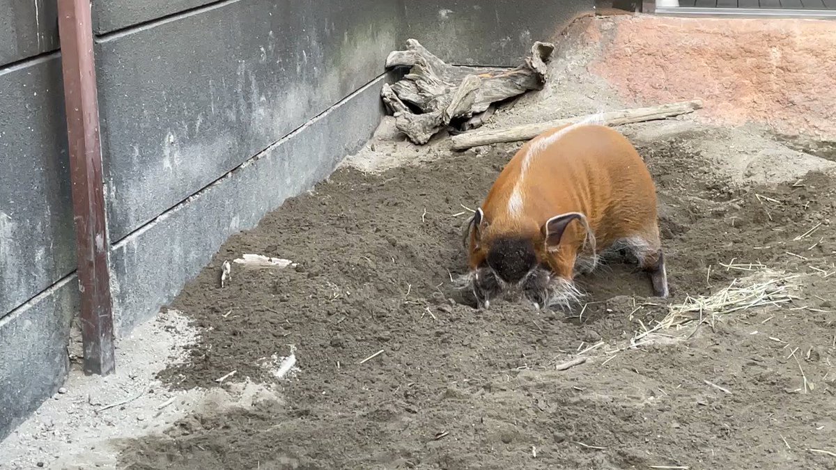 豪快に砂を巻き上げる#アカカワイノシシのタイヨウ🐗年齢を重ねても鼻の力は健在です(^^)#ズーラシア#ZOORASIA#RedRiverHog044415