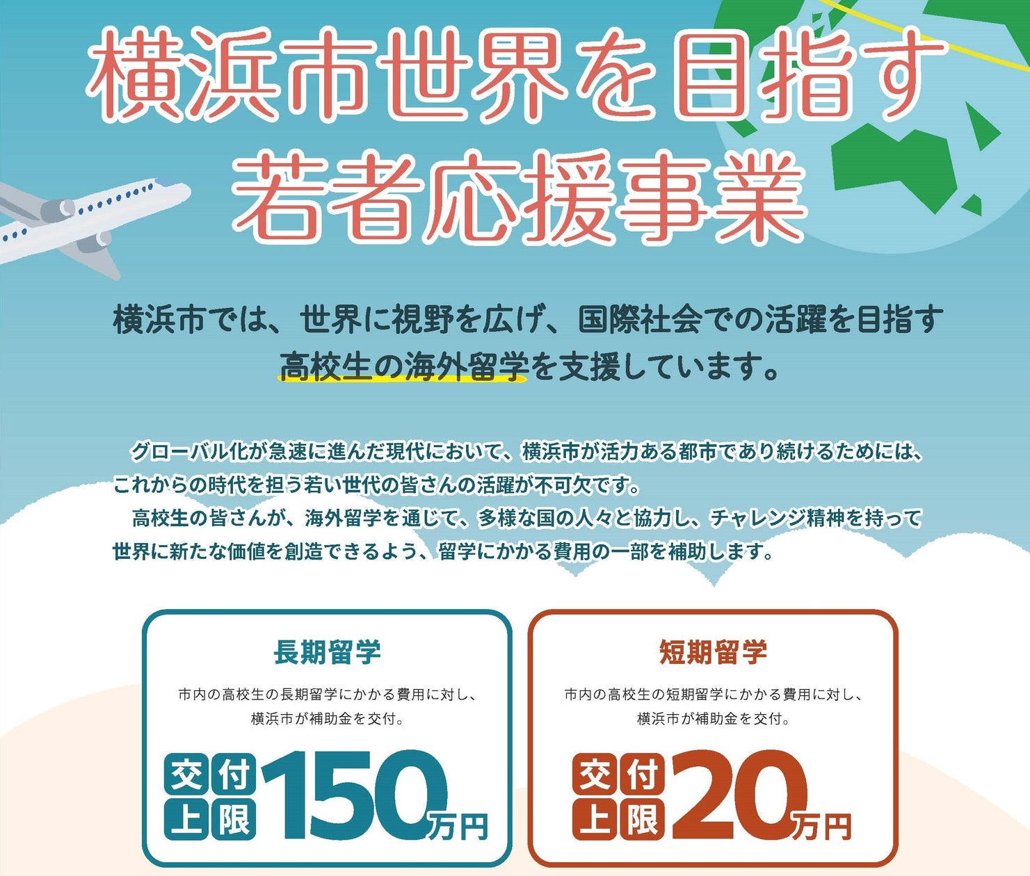 横浜市が留学にかかる費用の一部を補助します!横浜市在住・在学の高校生向けの海外留学支援制度を5月1日(木)から募集開始!長期留学は最大150万円、短期留学は最大20万円を補助!