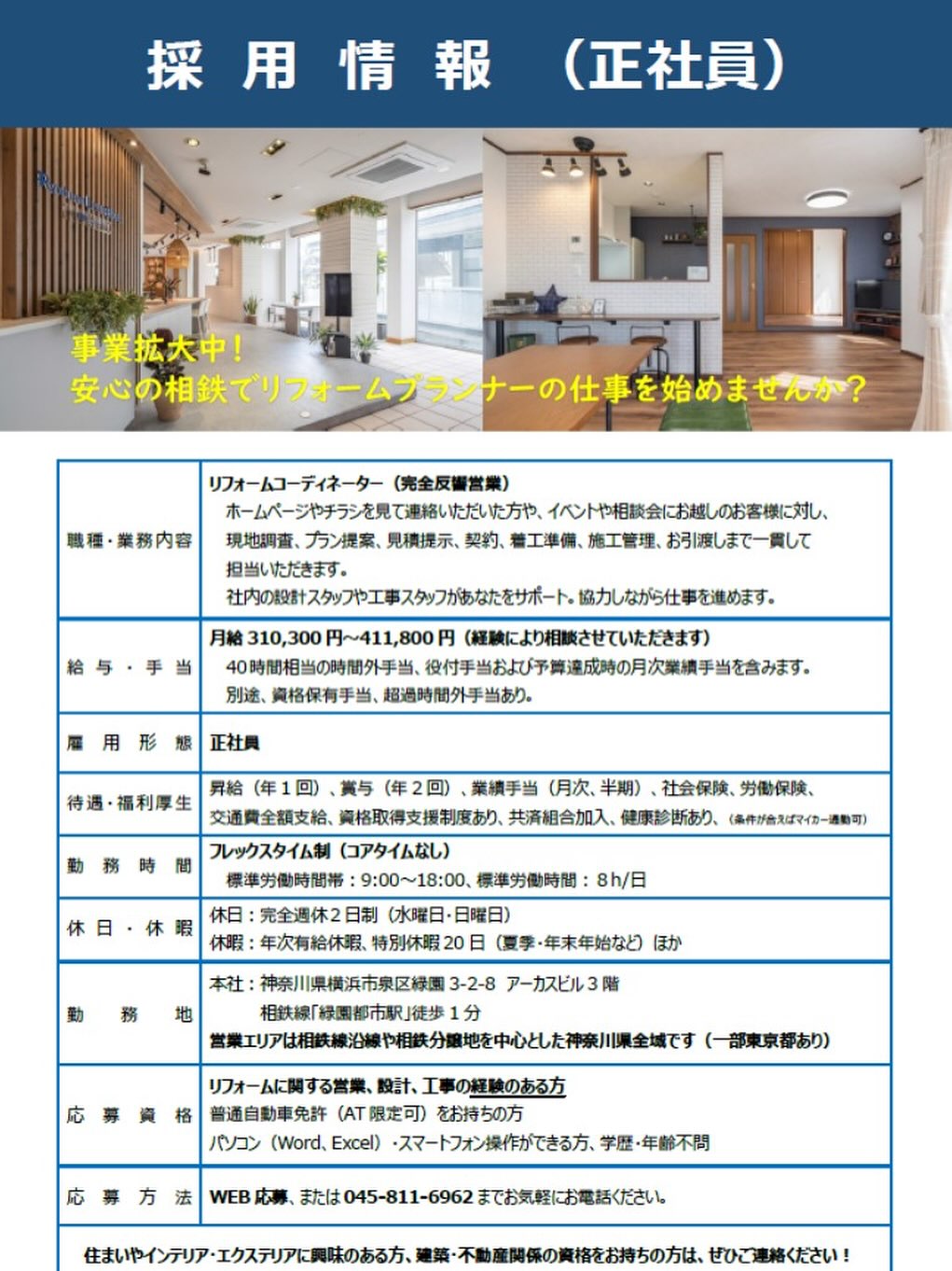 🏠事業拡大中!一緒に働く仲間を募集しています!📍職種:リフォームコーディネーター📍雇用形態:正社員📍勤..