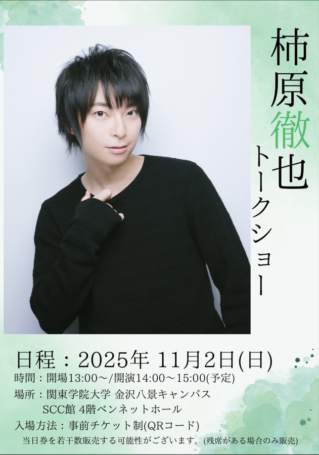 #柿原徹也 さんトークショー 前売チケットの先着受付は【本日23:59まで】 ここでしか聞けない学園祭限定トークをお見逃しなく! 一般も購入OK https://t.livepocket.jp/e/6rmat #平潟祭 #関東学院大学
