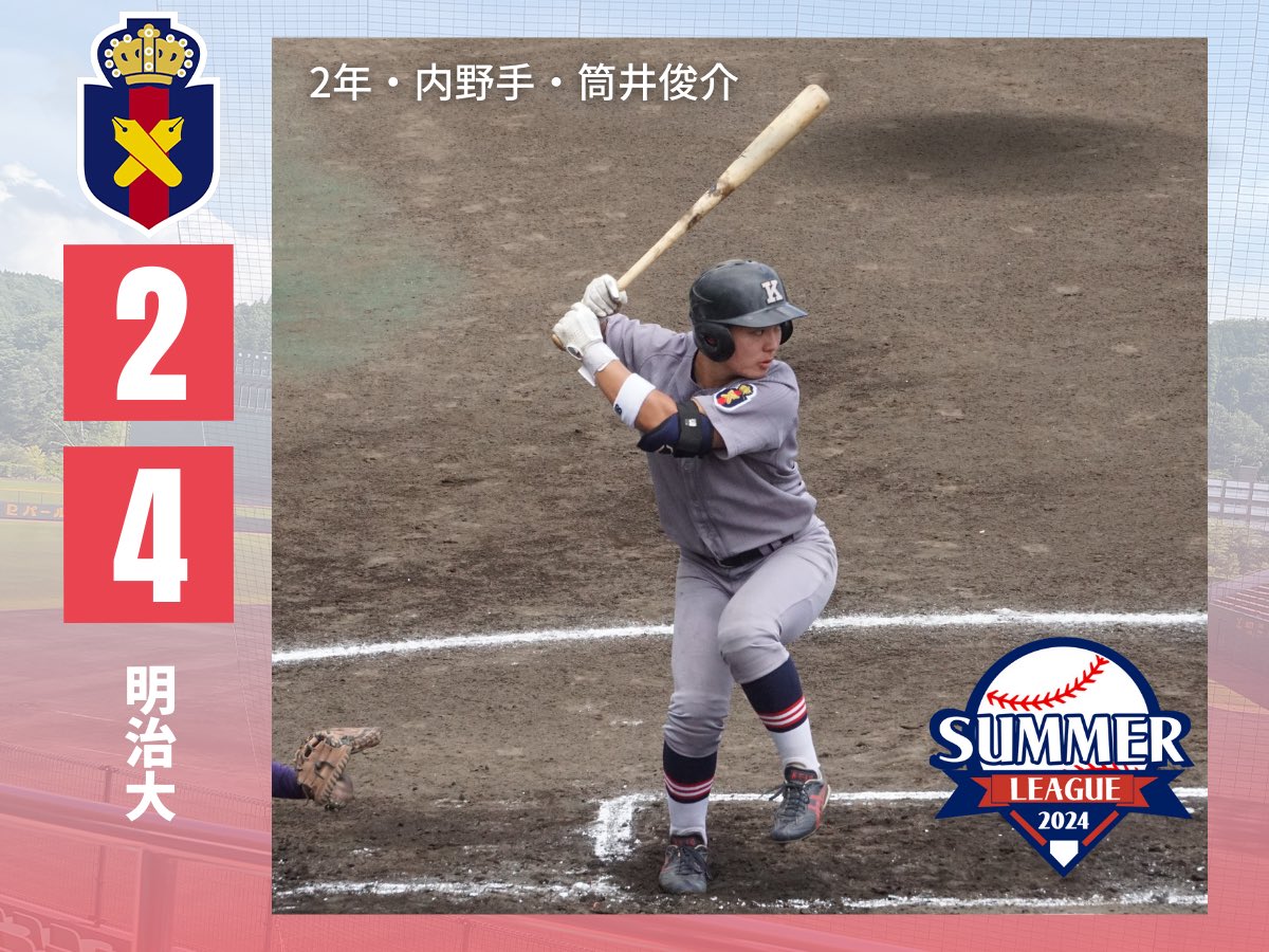 【第10回次世代育成大学野球サマーリーグ試合結果】●慶大(新人戦)2-4明治大慶010000001=2明00100300x=4#筒井俊介が猛打賞となる活躍を見せるも、あと一打が出ず、敗戦…。#keio..