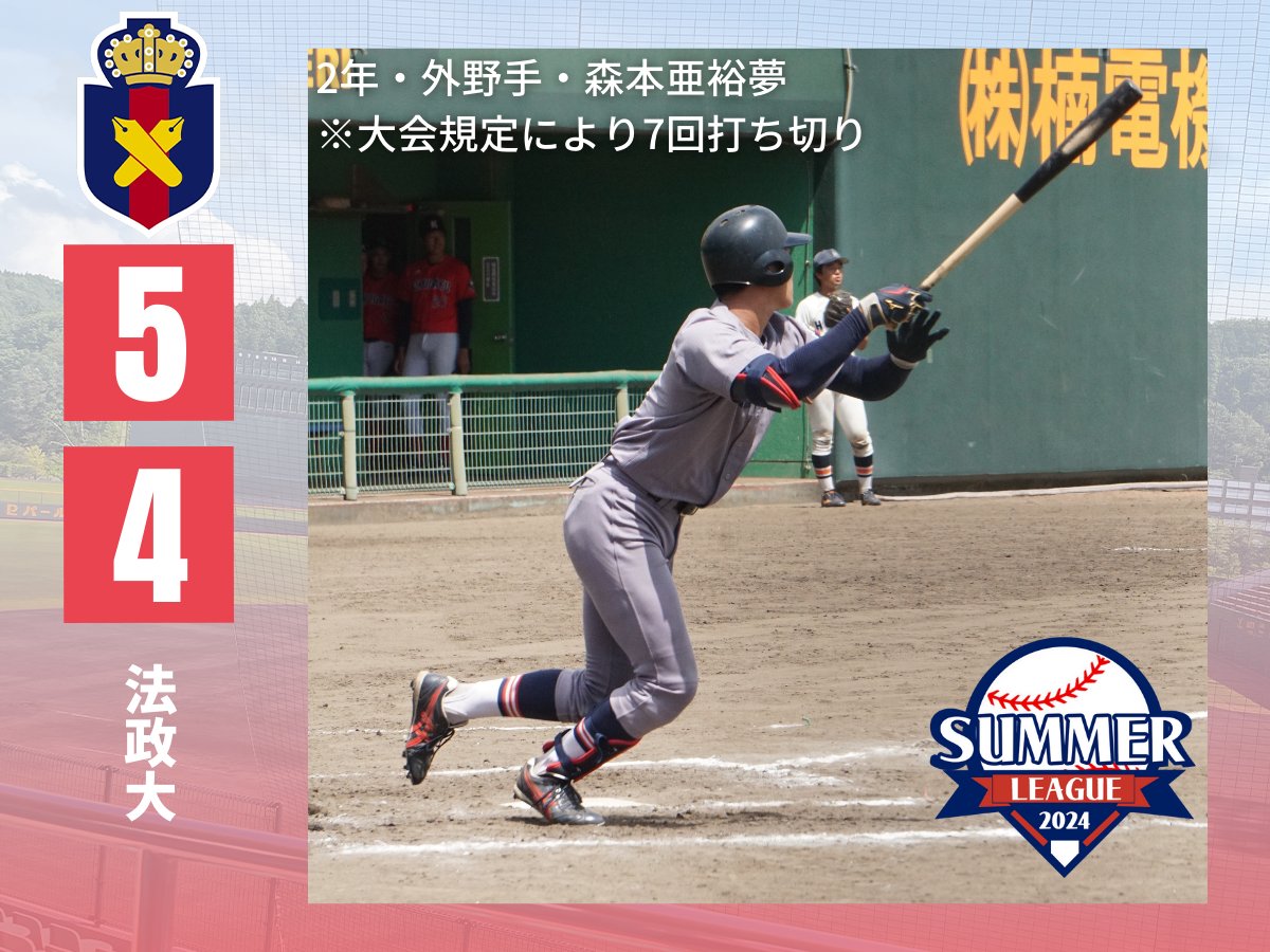 【第10回次世代育成大学野球サマーリーグ試合結果】○慶大(新人戦)5-4法政大法0020110=4慶0000005x=5※大会規定により7回打ち切り二死一二塁から#森本亜裕夢が適時二塁打を放ち、サヨナ..