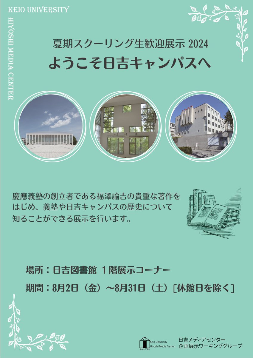 【夏期スクーリング生歓迎展示】ようこそ日吉キャンパスへ 2024 が始まりました!慶應義塾の歴史や貴重資料の紹介の他、日吉キャンパス・日吉図書館の歴史も盛りだくさんです。ぜひお立ち寄りください!(MO)