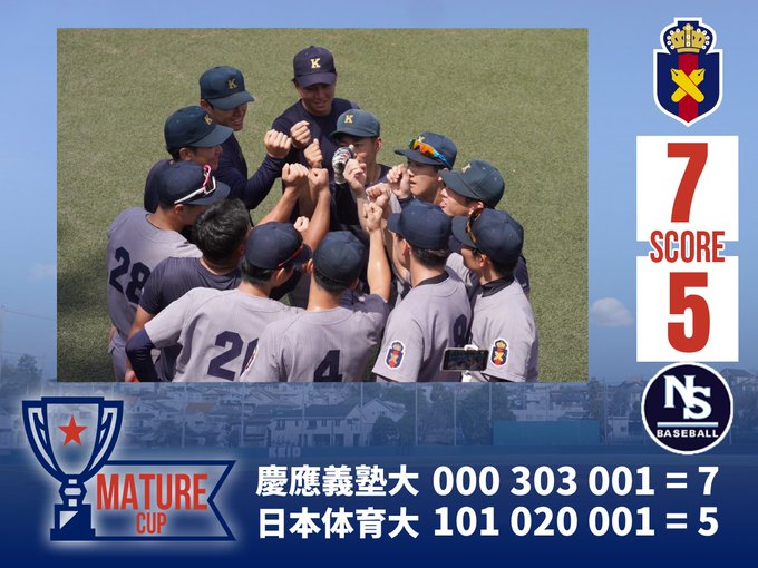 【試合速報】第7回MatureCup対日本体育大試合終了慶7-5日晴天の中行われたMatureCup対日本体育大。序盤相手に打ち込まれ得点を許す。だが4回、6回に堀江、織茂の適時打などで得点を奪い、逆..