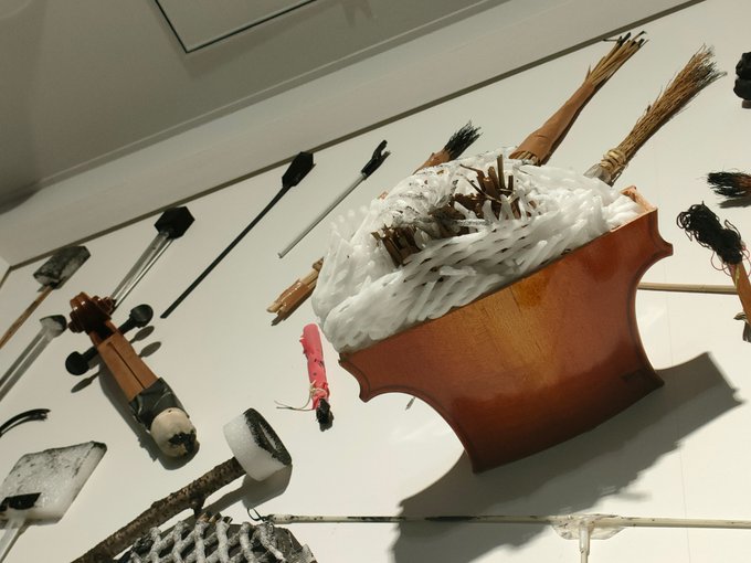 7/12(金)#み展観察日記《土を作る》捨てられていた廃材で作った筆の展示を見ていると、気になる作品が。中学時代までバイオリンを弾いていた中の人()には見覚えのあるシルエット。これはひょっとして…?#..