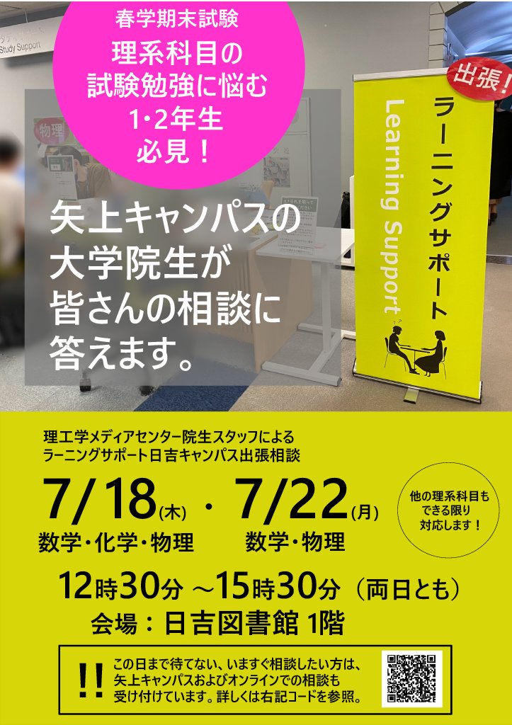 【理系科目でお悩みの方へ朗報】明日7/18(木)と7/22(月)に、理工学メディアからラーニングサポートの院生スタッフの方々が出張相談にいらしてくださいます!試験前、理系科目の不安なところをゼロにして..