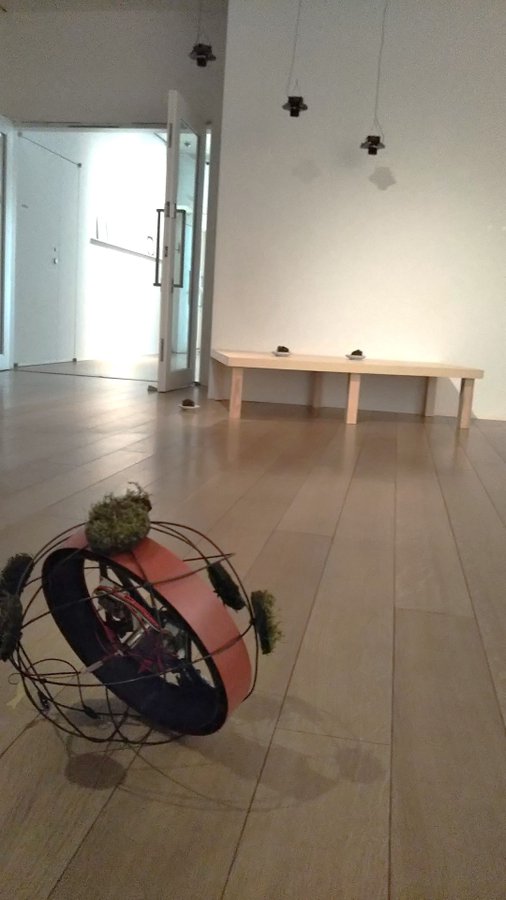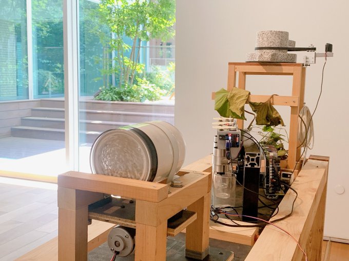 6/12(水)夕方・晴れ#み展観察日記:《粉を挽く》外は完全に夏模様......そんなテラスの光を燦々と受けるRoom2の《粉を挽く》機械には、新たに、外の植物が投入されていました!()#KeMCo#..
