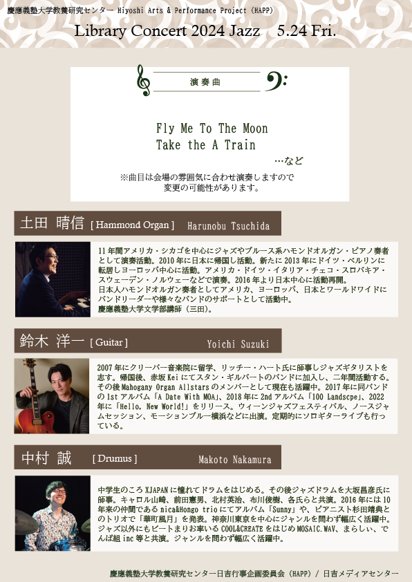 【LibraryConcert】本日のジャズコンサート@日吉図書館は、15:00~と17:15~の2回開催、各回約50分です!プロミュージシャンの生演奏を間近で聴ける貴重な機会です。ぜひお気軽にお越し..