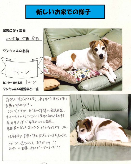 みなさん、こんにちワン! 今日は新しい飼い主さんからのおたよりを紹介するね。 新しい飼い主さん、ありがとう! #保護犬 #新しい飼い主さん決定 #譲渡 #神奈川県動物愛護センター