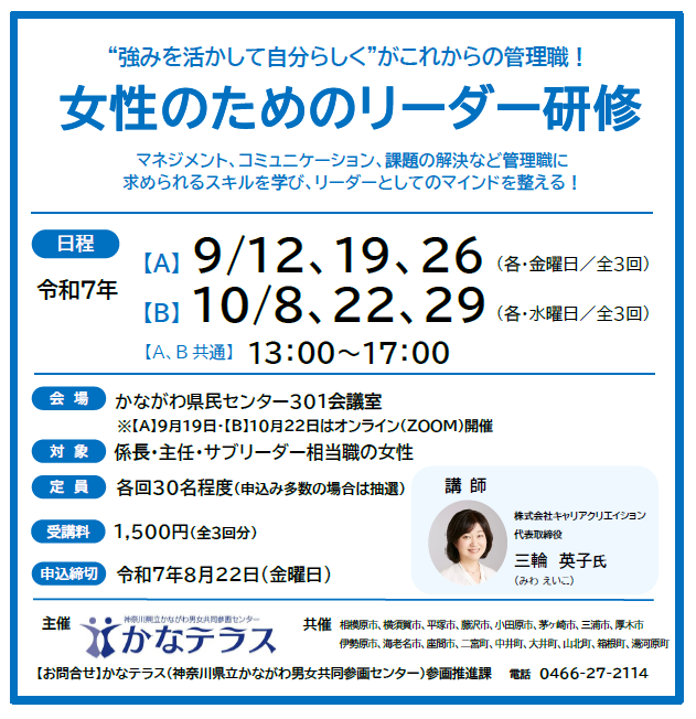 【かなテラスたより】「女性のためのリーダー研修」<申込締切8月22日>管理職としての活躍が期待されている女性に向け、「自分らしいリーダーシップ」をテーマに組織のリーダーを担うためのスキルやマネジメント..