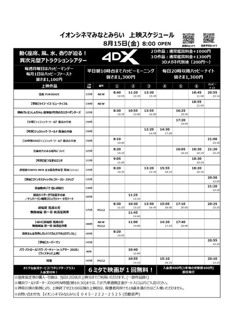 8/15(金)~8/21(木)の上映スケジュールです!■劇場は平日朝8:00、土日朝7:30〜OPEN上映スケジュールはコチラhttp://x.gd/Ag9Cb新作#劇場版鬼滅の刃無限城編第一章猗窩座..