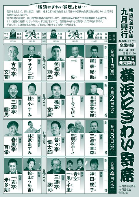 【横浜にぎわい寄席】9月「横浜にぎわい寄席①~⑦」も多彩な演者が日替わりで登場!落語、講談、漫談、奇術、音曲、漫才、俗曲、紙切り、粋曲、カンカラ三線、コント、太神楽曲芸、と様々な芸種をお楽しみいただけ..