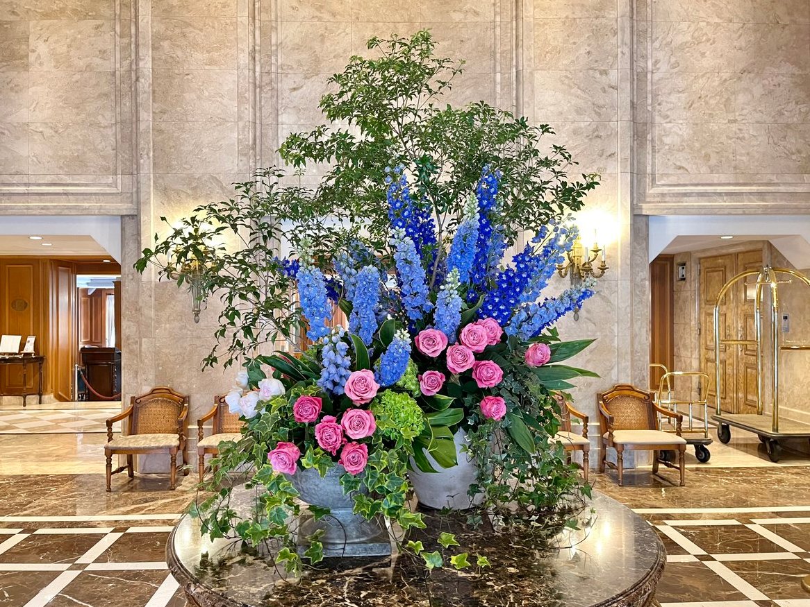 *今月のロビー装花*今月のテーマは「春のガーデン」山下公園の薔薇が咲き誇る光景を、ホテルでもお楽しみいただけるようなロビー装花に仕上げました🌹🌿#ホテルニューグランド#横浜ホテル#クラシックホテル#今..