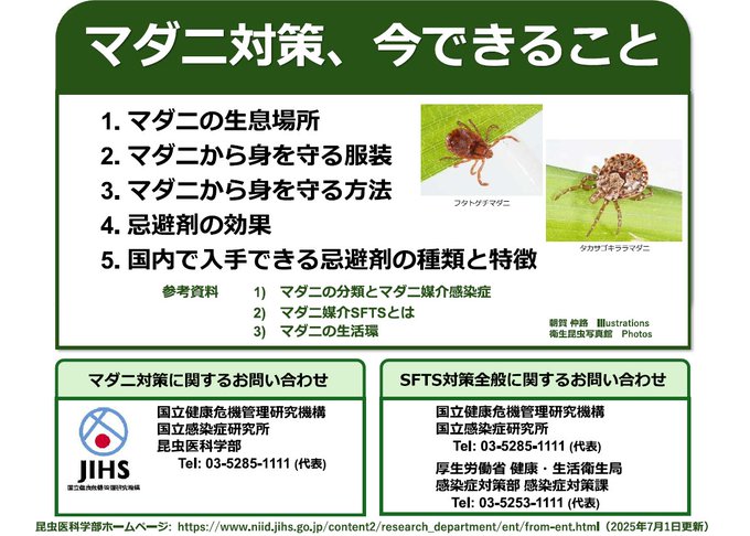 【#マダニに注意】県内においてマダニに咬まれたことが原因だと思われる重症熱性血小板減少症候群(SFTS)の感染が確認されました。春から秋にかけてマダニの活動が盛んになるので、森林や草地に入る際は、肌を..