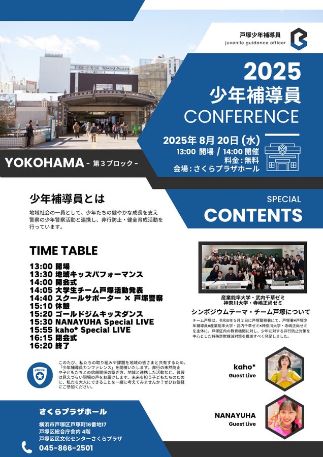 【戸塚警察署からのお知らせです】8月20日、戸塚少年補導員による、2025少年補導員カンファレンスを開催します。皆さま奮ってご参加ください。